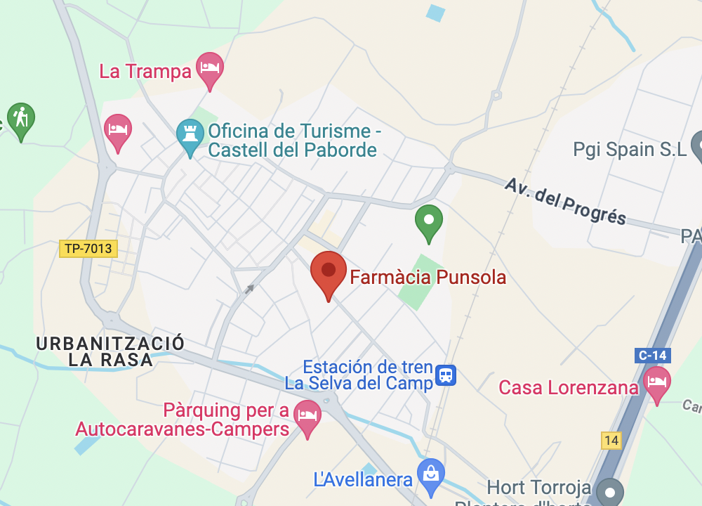 Farmàcia i Òptica Av. de Joan Puig i Ferreter, 843470 La Selva del CampHorari: de Dilluns a Divendres de 9 a 21h. Dissabtes de 9 a 14h.Telf. 977 844 415 Facebook Instagram Correo electrónico AESAdreça: C. Hospital, 13, – 2ª planta, despatx 9 43470 La Selva del Camp Contacte: E-mail: info@aeselvacamp.cat